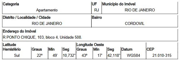 Localização: Apartamento em Endereço: RUA PONTO CHIQUE | Bairro: CORDOVIL | Número: N. 103 APTO. 508 BL 04 RIO DE JANEIRO - RJ
