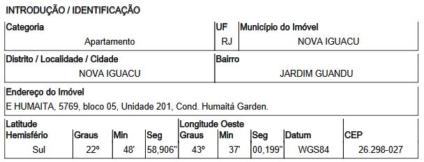 Localização: Apartamento em Endereço: ESTRADA HUMAITA | Bairro: JARDIM GUANDU | Número: N. 5769 APTO. 201 BL 05 LT 01 QD 03 NOVA IGUACU - RJ