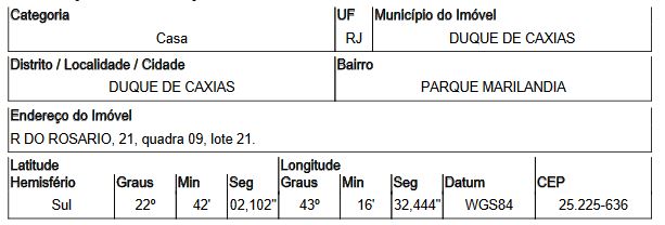 Localização: Casa em Endereço: RUA DO ROSARIO LT 21 | Bairro: PQ ADELAIDE | Número: QD 09 DUQUE DE CAXIAS - RJ