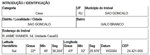Localização: Casa em Endereço: RUA JAIME WAINER | Bairro: GALO BRANCO | Número: N. 54 CS 02 LT 10 QD B SAO GONCALO - RJ