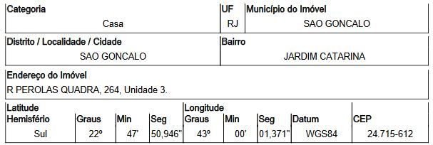Localização: Casa em Endereço: RUA PEROLAS | Bairro: JARDIM CATARINA | Número: N. 264 CS 03 SAO GONCALO - RJ
