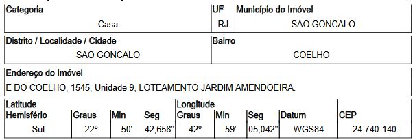 Localização: Casa em Endereço: ESTRADA DO COELHO | Bairro: COELHO | Número: N. 1545 CS 09 SAO GONCALO - RJ